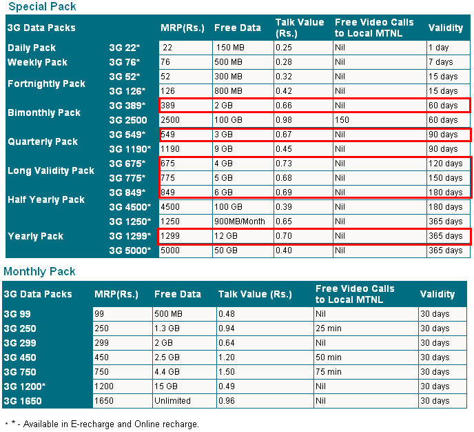 MTNL Mumbai’s all 3G data plans/packs can be use while Home network as well as National Roaming on BSNL across India. All these new plans will be available from today via On-line Recharge at MTNL website or E-topup at MTNL Customer Service Centers and retailers across Mumbai circle.